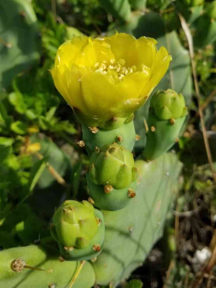 いつもの河川敷の荒れ地に自生しているサボテン🌵(ウチワサボテンっぽい形)。今朝見に行ったら黄色い花がいくつか咲いてました!
