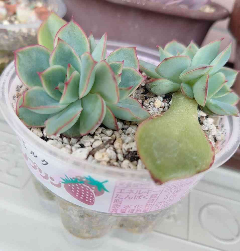こちらはプッチンプリンイチゴの容器に入った(笑)花うららの葉挿しっ子♡*゜