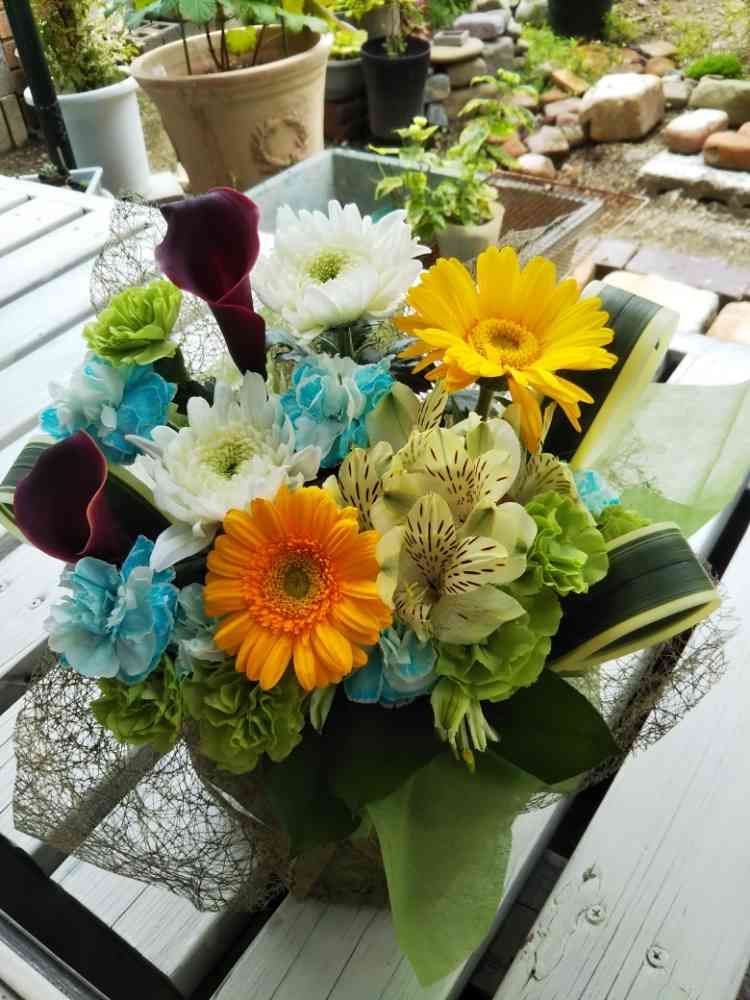 菓子は切らしても花は絶やさないように。グリーンは、庭のキキョウランで代用(笑)