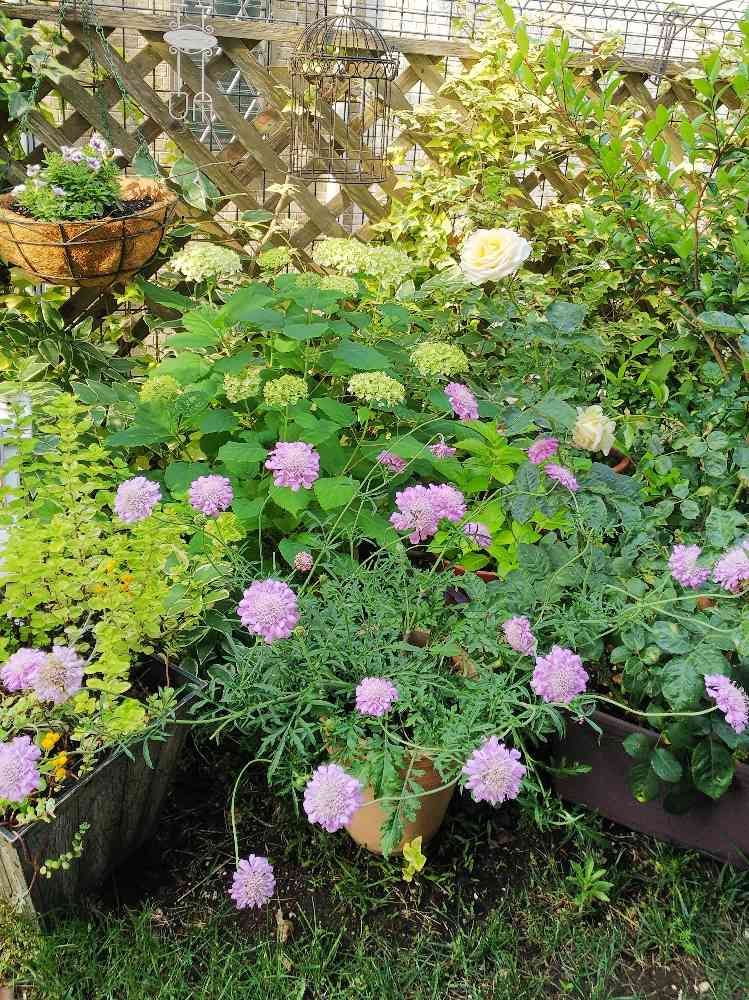 スカビオサ の暴れ具合が素敵❣️ナチュラル感出してくれてる👍アナベルと引き立てあってる😃