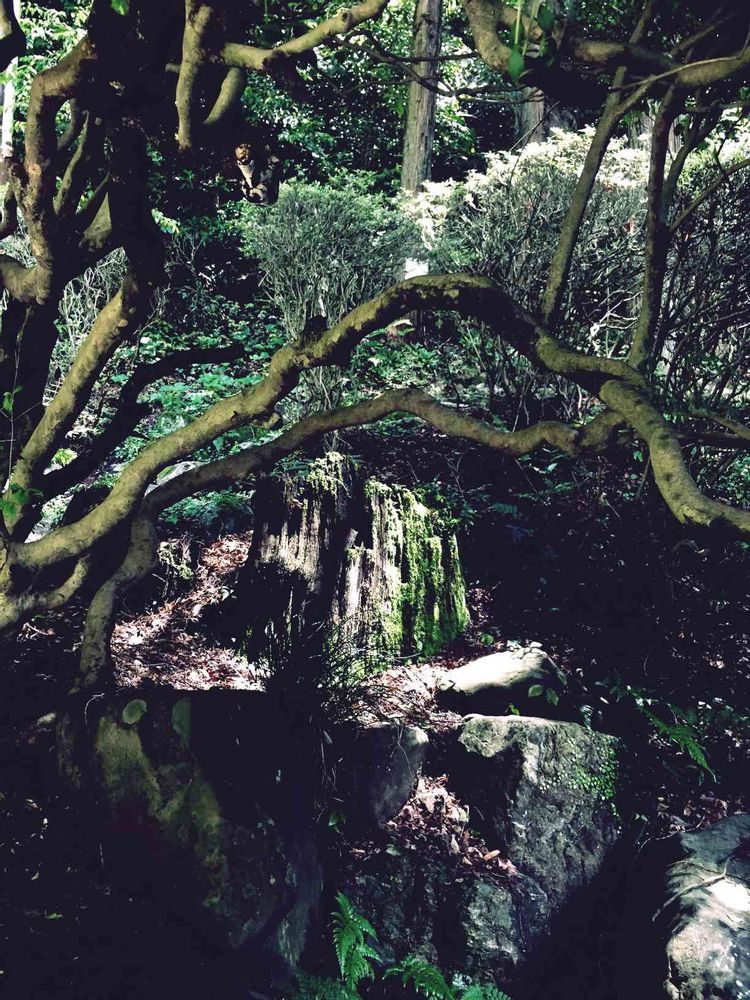 神社の裏庭。切り株に光が当たって神秘的でした✨