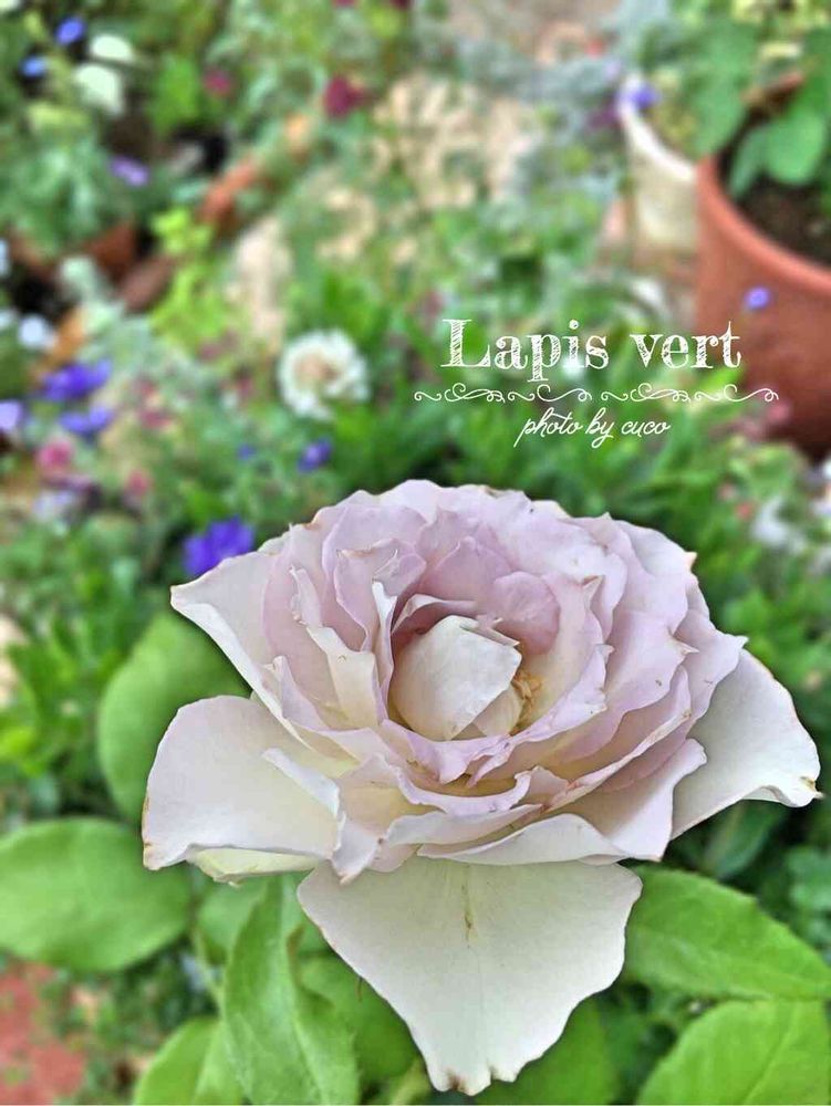 中心はラベンダー紫、外側は黄緑の花弁という(私にとって)最強の薔薇(^◇^;)
