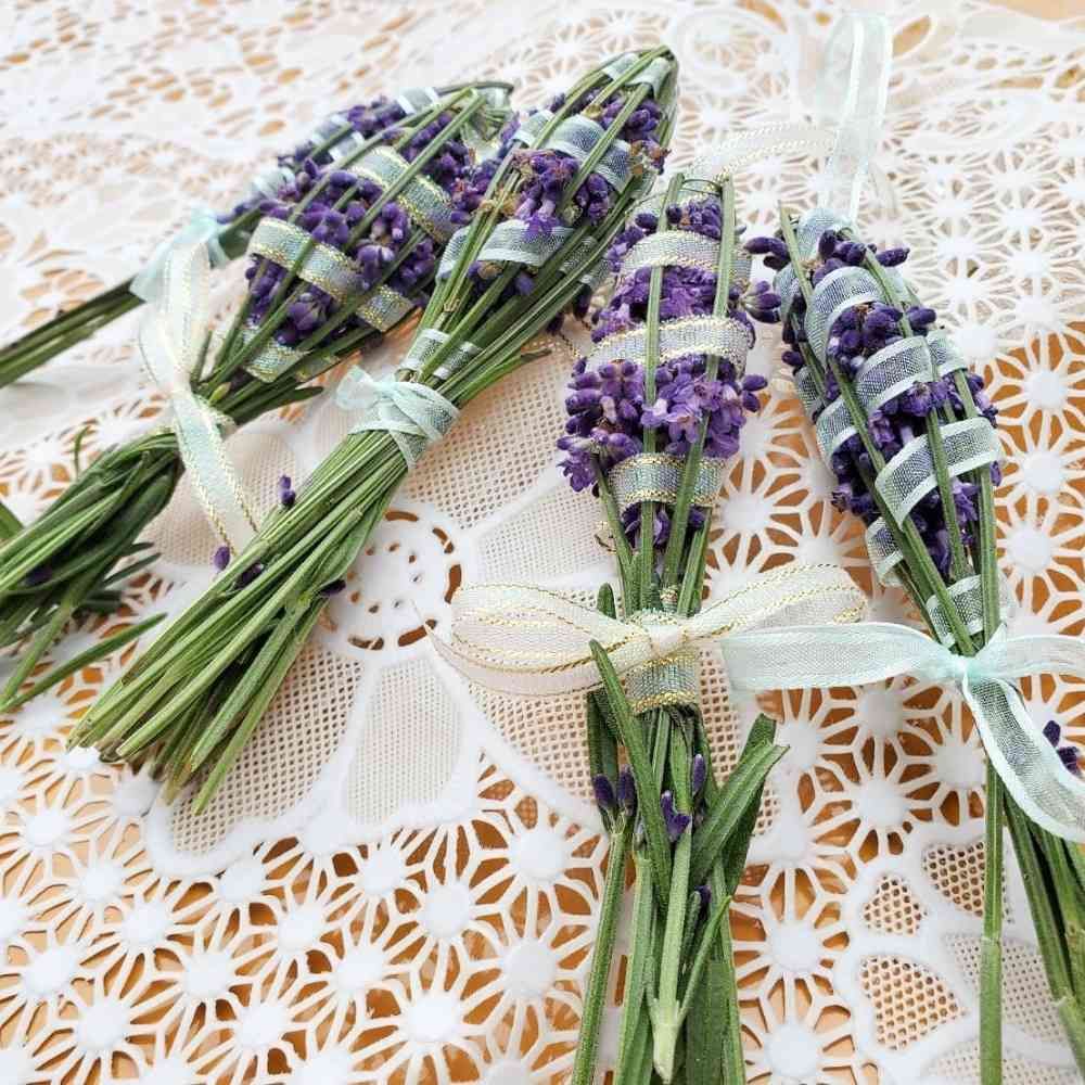 簡単ですよ💐ラベンダーの奇数の本数を花💠が付いている方に細い🎀のヒモ(少し飾る分3㎝くらい)出して所にワイヤーを2~3回巻きとめますよ。そしたらラベンダー(長いリボーンの方で)の茎を一本ずつ折りながらのそ間を互い違いにリボーンを網込むだけで出来上がりますよ🥰試して作ってみて下さいねぇ💐✨