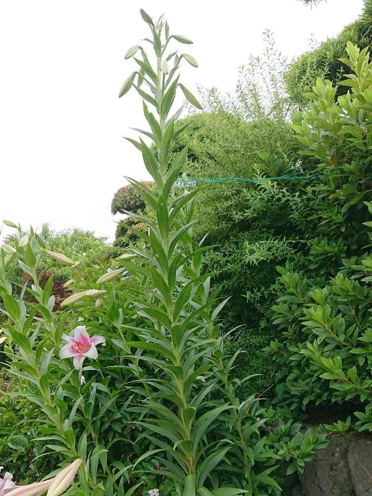 実家の庭ですが自慢出来るテッポウユリ。茎が倒れないように後ろのツヅジの枝でくくりつけてます。