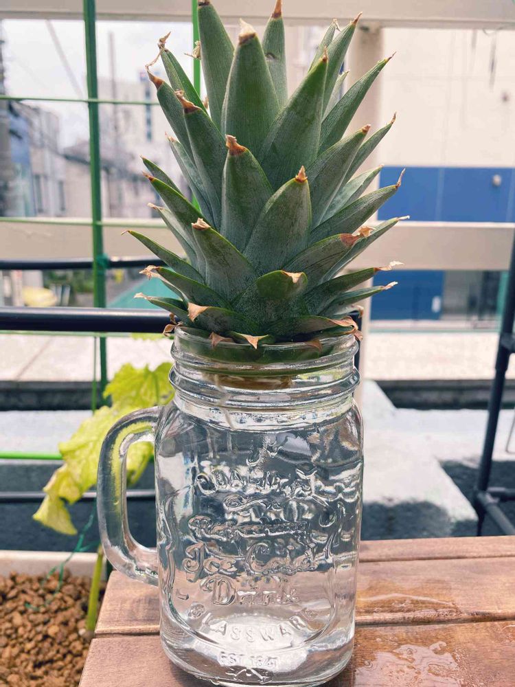パイナップルの水耕栽培始めました🍍前に一度、失敗してしまったので、今回は少し大きめの瓶で再チャレンジ💪今、根っこが生えてきたところです😆