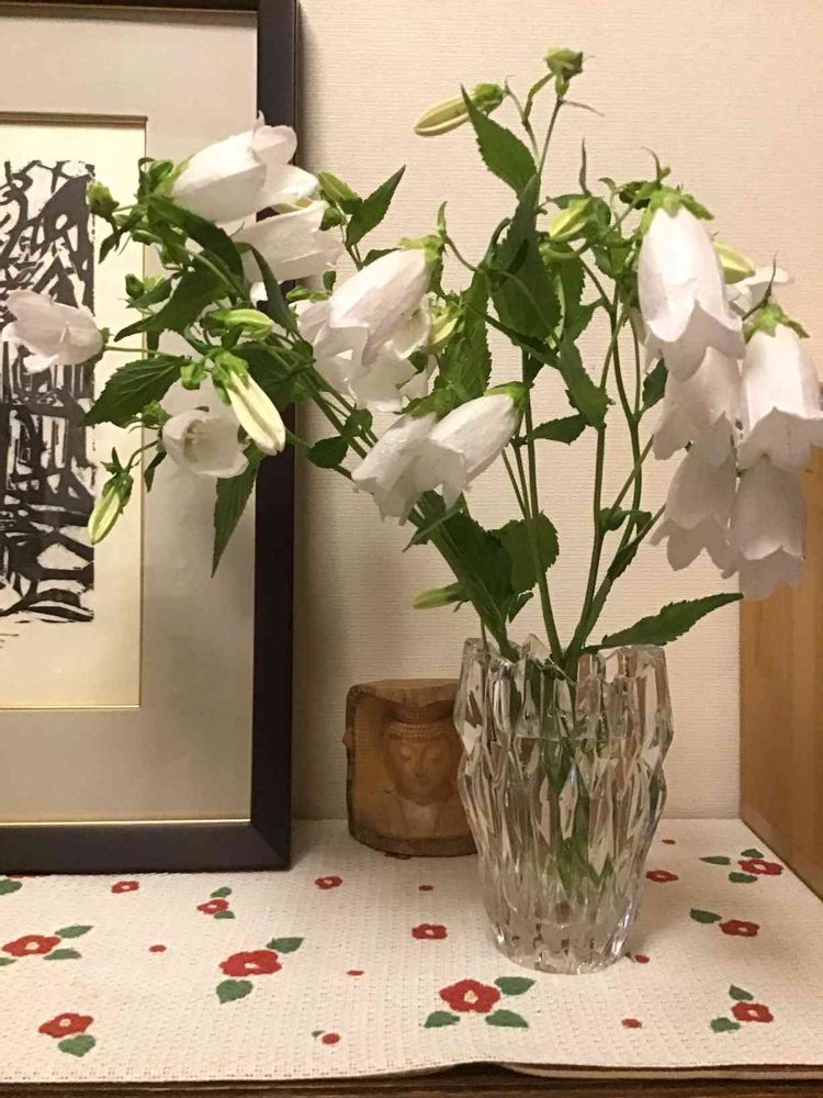 今朝は、ホタルブクロ は、白くて スッキリしているので、爽やかな、明るい感じを 出すには この花瓶が 明るくって良いかな?