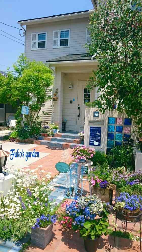 素敵な玄関、花壇、ブルーが映えていいですね💕