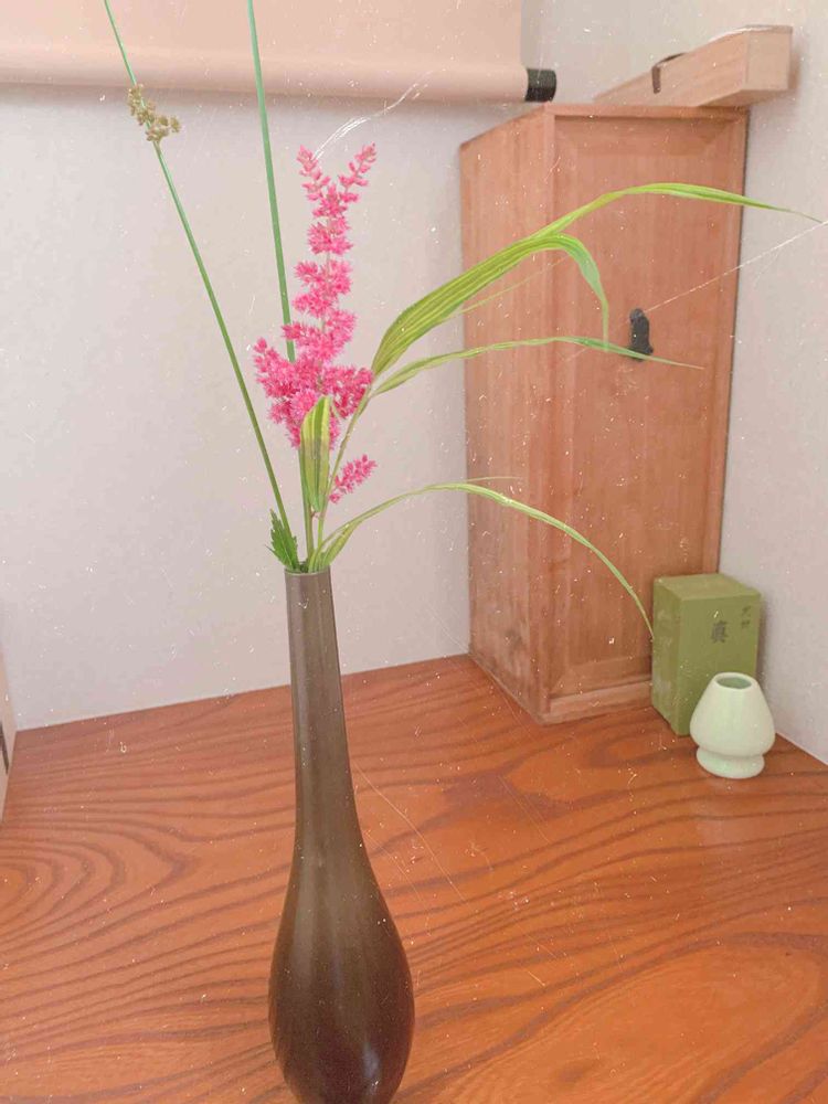 庭先の、一輪だけ咲いた紅色しょうまと風知草。