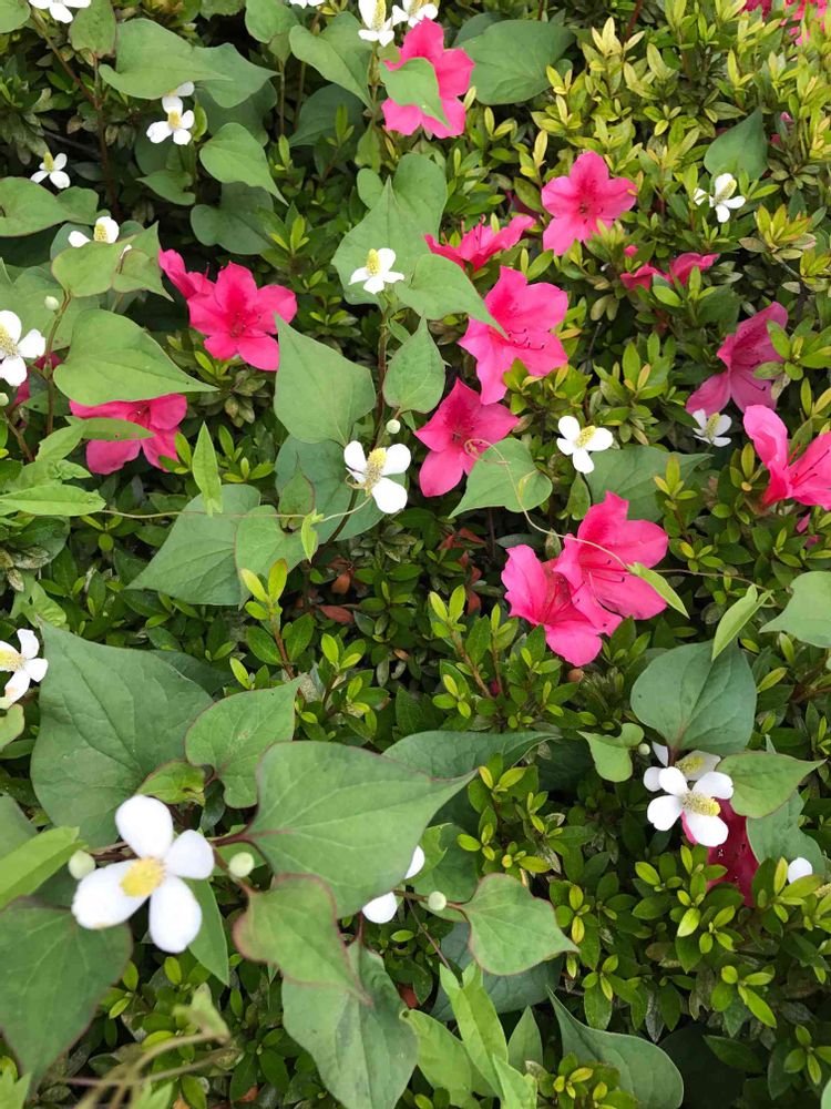 サツキのピンクと、ドクダミの白が紅白で素敵✨