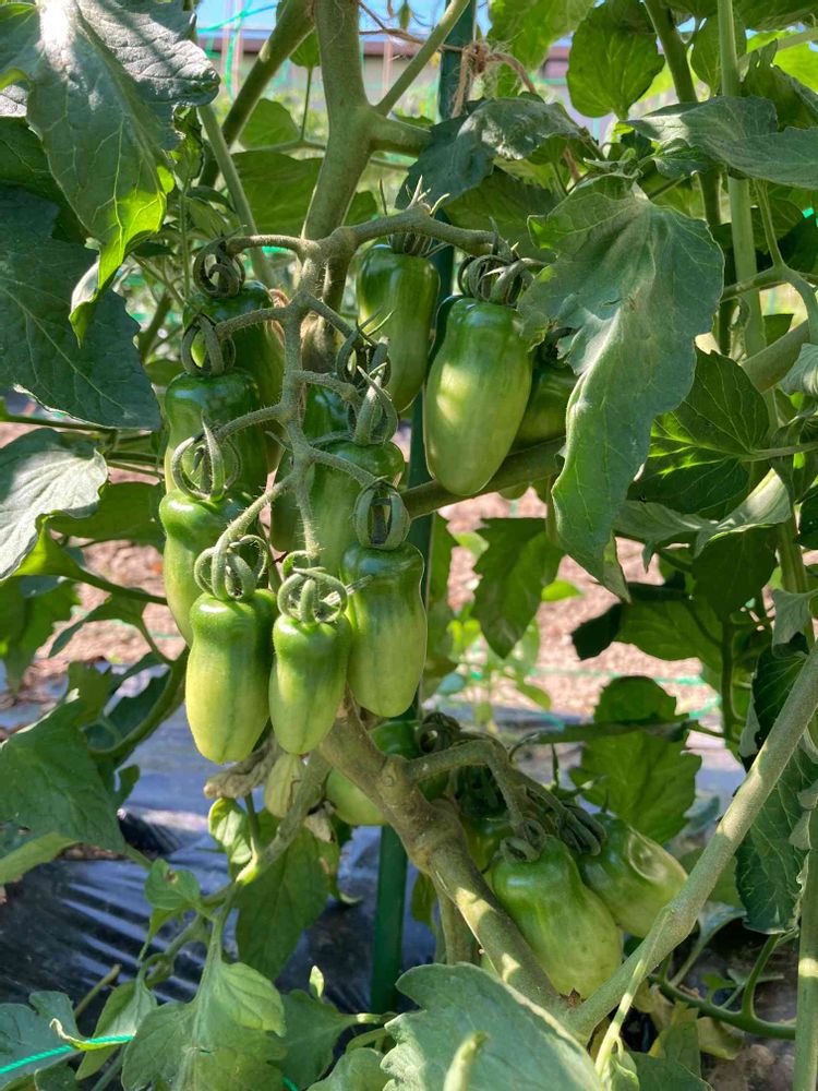 ソバージュ栽培のサンマルツァーノは葉も茂って、実も成長しています。