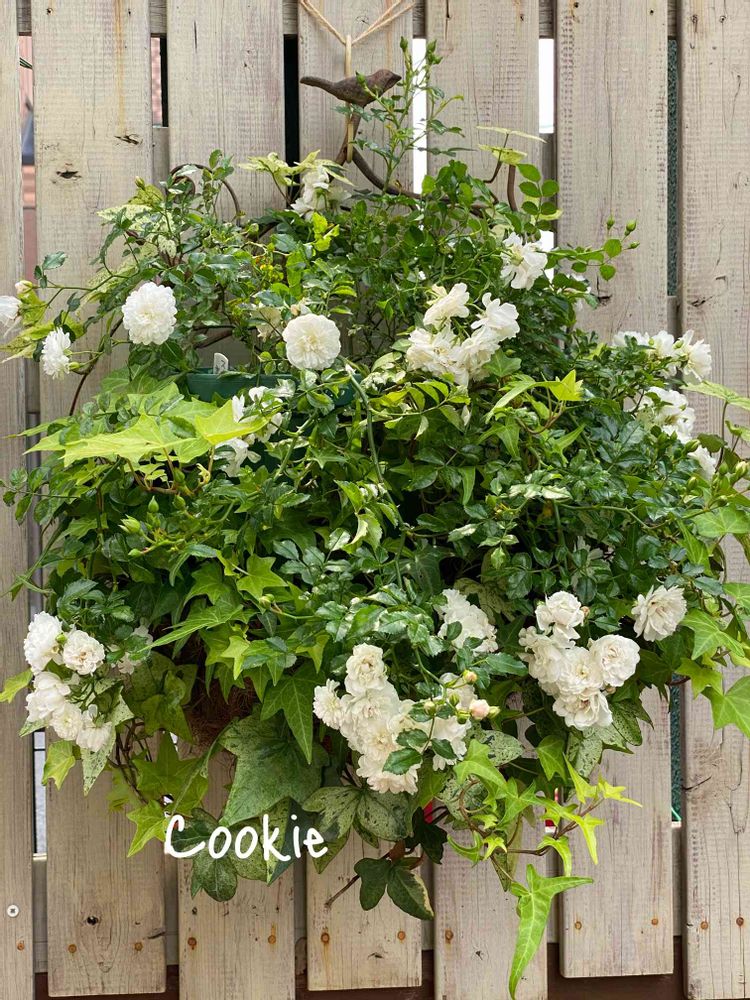京成バラ園のミニ薔薇スノーシャワー が咲いています。小さなアイアンバードのハンギング なのでアイビーだけ植え込み、薔薇はその上に根が健全に育つスリット鉢に見えないように、あ、見えますね😆💦、植え込みして載せています😜