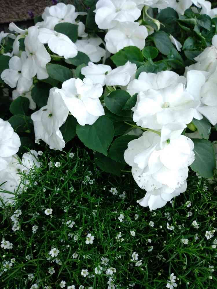 寄せ植えのカスミソウとインパチェンス