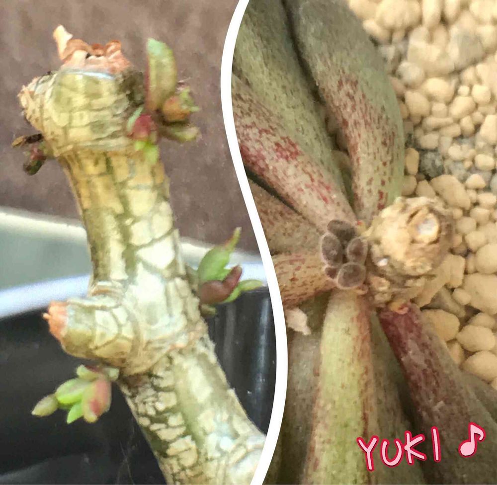 左の写真は昨年秋にグリネちゃん欲しさにAmazonで12ポットよりどり(値段は忘れたけどお安かった😊)の多肉ちゃんを買った時に入っていたテトラゴナさん。多肉ちゃん=寒さに弱いと書いてあったのでとりあえず屋内で育てていたら知識もなかったため、物の見事に徒長…💧今回、本格的に多肉ちゃんを育て始めたのでカットして挿し木にしました。茎も捨てずに取っておいたらひと月弱で新しい芽が😍🎶挿し木にした方も根付いてるかも😊