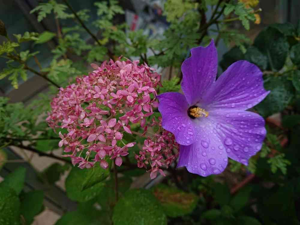 アナベルさんと、ブルーハイビスカスさん、並びました。恥ずかしいのかな🎵汗かいてますね😁。お似合い❗❣️。
