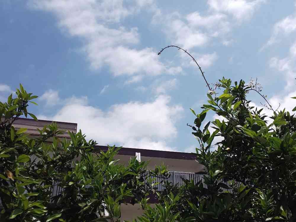 気持ちの良い青空☀️見上げるとみかんの木を渡り歩って🔄触手を伸ばしているつる性植物❗️😯~どこに行きたいのかな❓🤔剪定しなくちゃ😅💦