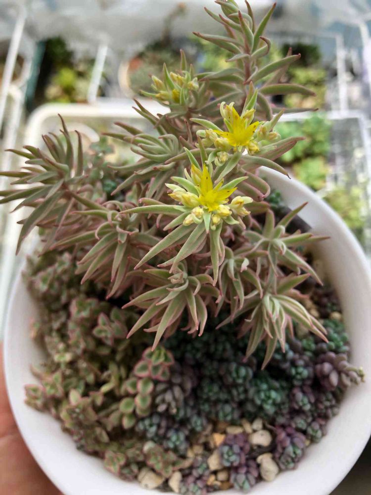 昨日セダムばかりを1つの鉢に植え直してその中につぼみを付けた覆輪万年草ありました☺️