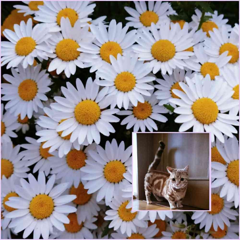 お花の中に可愛い🐱ちゃんが🧐。今日は🐱二回目のお医者さんに行ってきました。注射💉は免れお薬の処方のみになりました😆。診察頑張ったので、おばあちゃん👵のお庭の💠と🐱のコラボでupしちゃいます🙇。