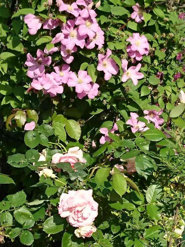 強風で倒れたクレマチス💗が🌹ピエールさんと並んだのでパチリ📷