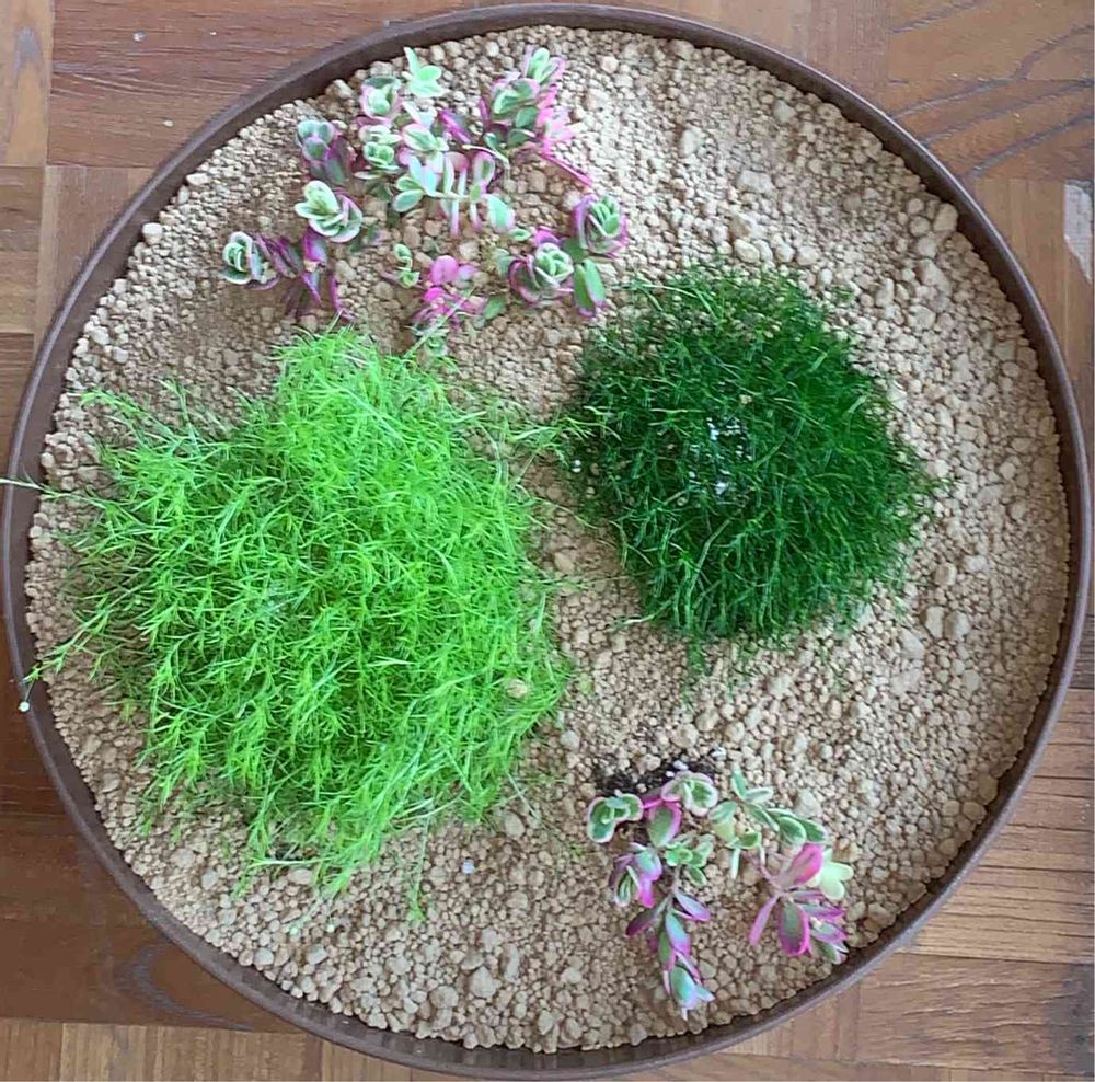 株分けしたポーチュラカマジカルキューティーをしばらく前にもふリッチことアイリッシュモスことサギナを植え付けた大鉢に植え付けました。うん写真がブレブレ😂
