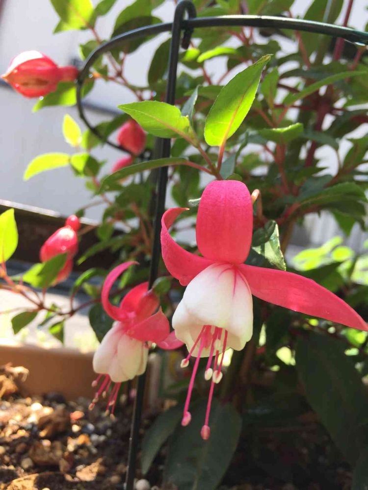 フクシア。何気に植えて(手間かかる系か?)と思ってたんだけどそうでもなく、赤いイアリングがポンポン咲いて嬉しい。