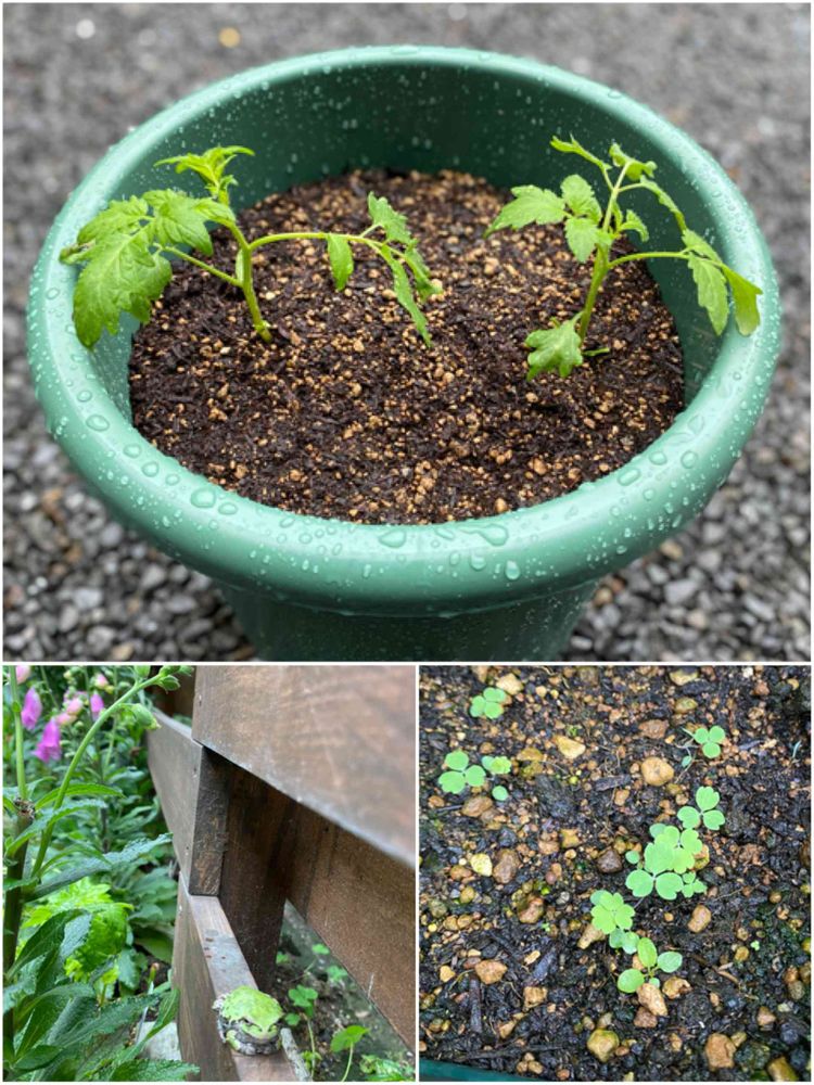 a: 以前、本葉の出てたスーパーのミニトマト🍅 成長したので今朝、2本に植え替えました🌿