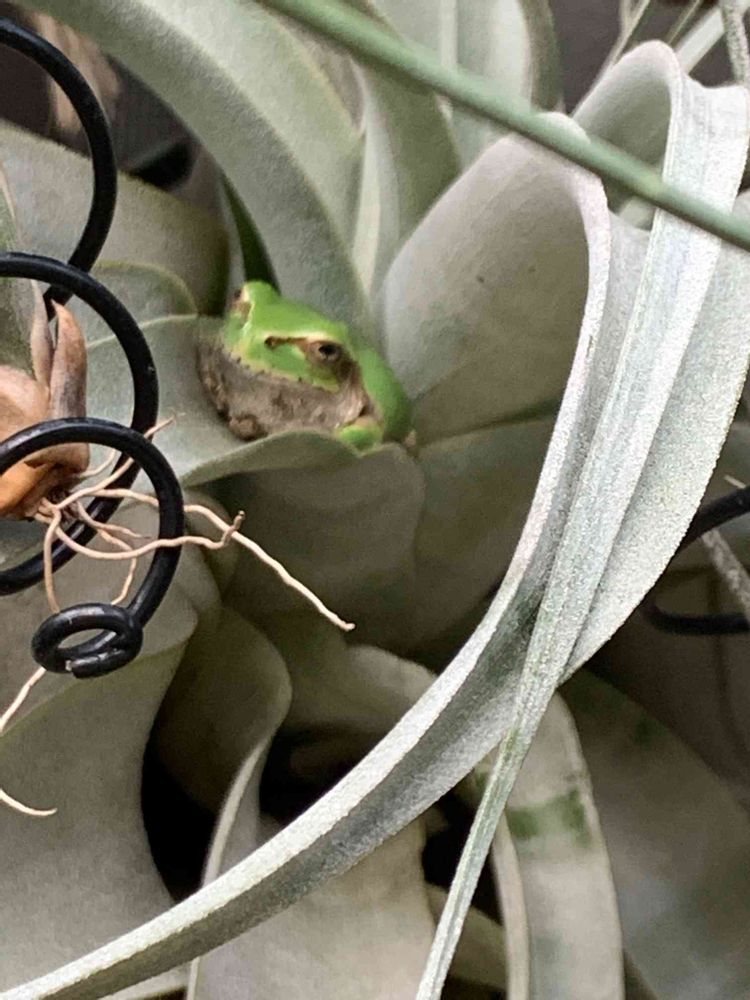 いえ、私のところはキセログラフィカ5株とその他沢山の種類のチランジアが外に作った檻の中にギュッと詰まっているので、そこに点在しています。期間は秋の終わりまでですねぇ。冬が来たらどこかで冬眠されてる模様。緑が多い場所なので、寝る場所には困ってないかと。