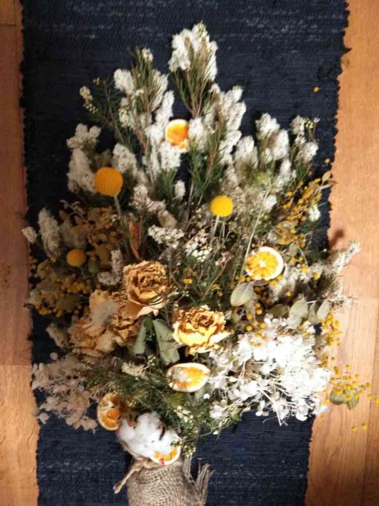 薔薇やオレンジ、ミモザ、漂白アナベル、綿を加えたら巨大になりました。