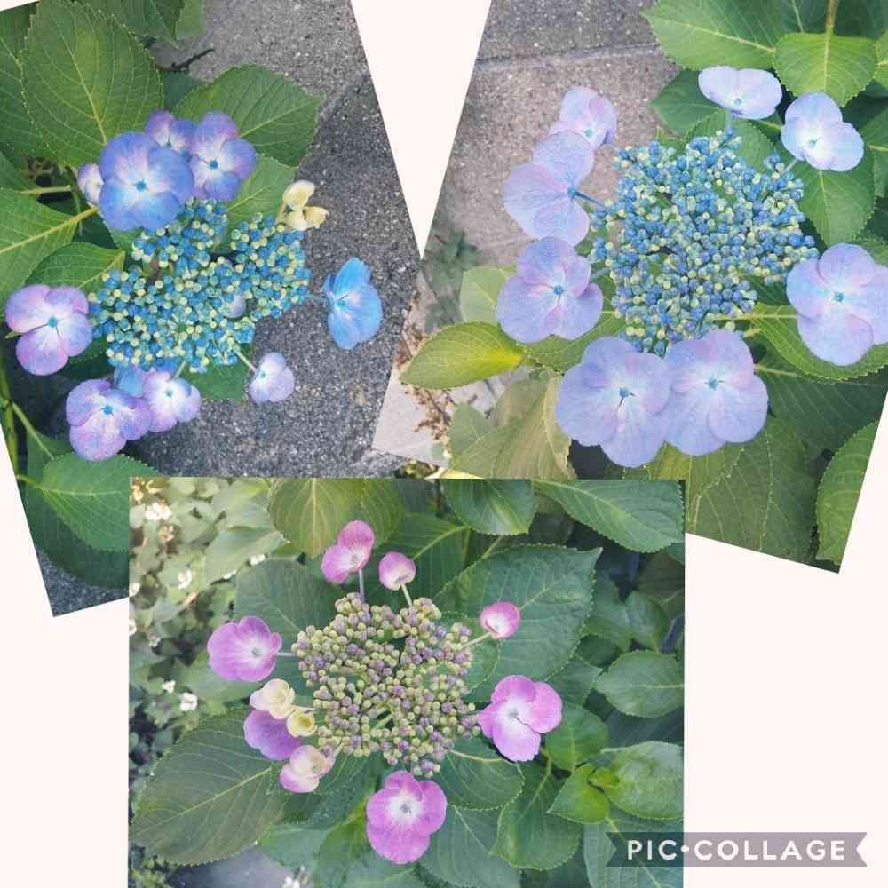 一本の紫陽花の木に、色のちがう花がさいてます。亡き母が植えてくれました!