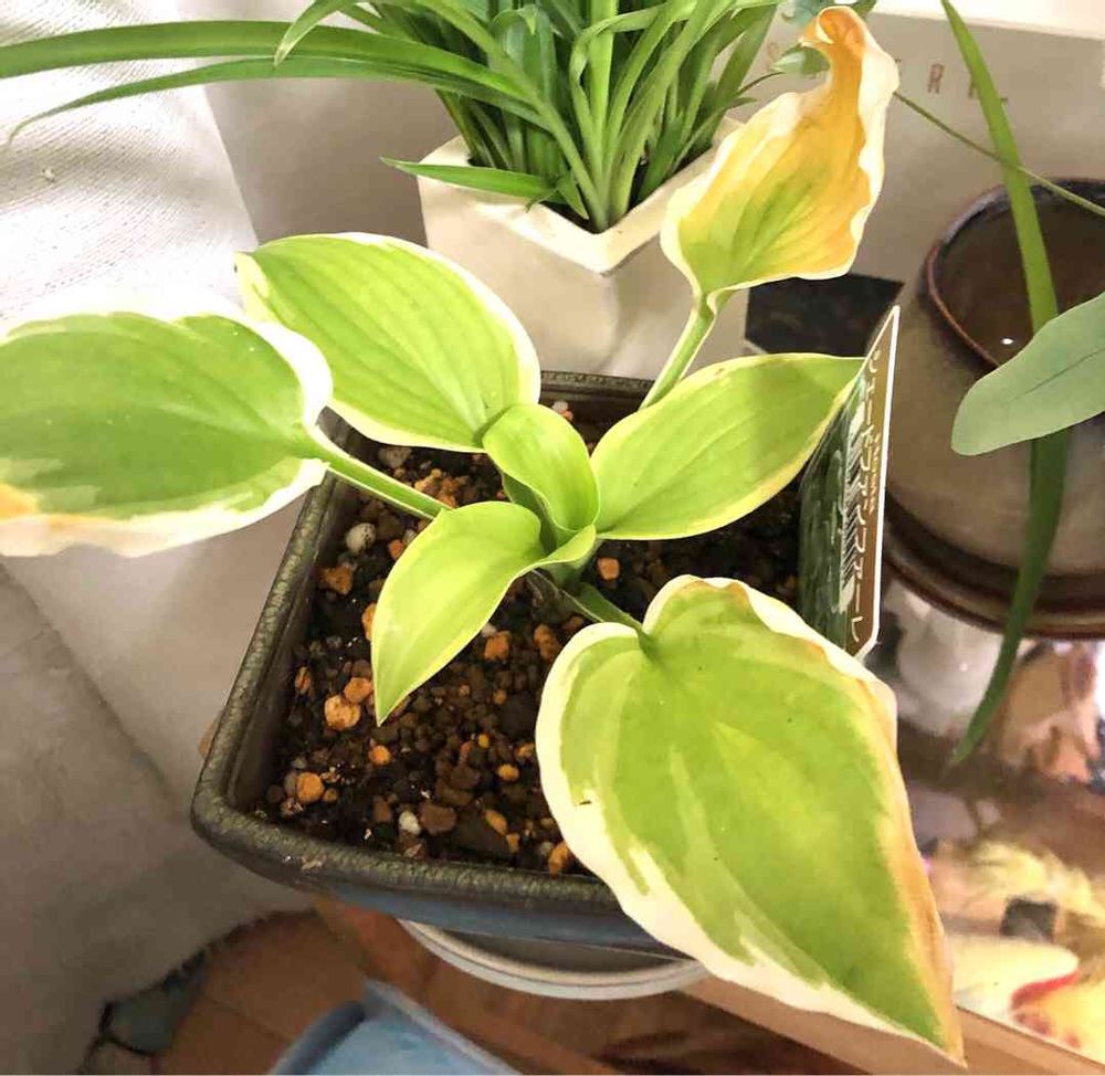 イギリス人の人に勧められてホスタ、つまりギボウシを観葉植物のように育ててみようと思って買ってきた。ギボウシを部屋で育てるという発想がなかったのでびっくり!そして、部屋の中の陽が入る所に置いたら葉が焼けたので、さらに陽が当たらない明るい場所に避難した。