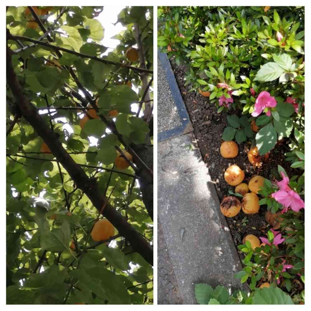 4月の花の時期は通りピンク色に染まります。実が成ってるの初めて見ました。誰にも採られず落ちてる姿はちょっと悲しい😢