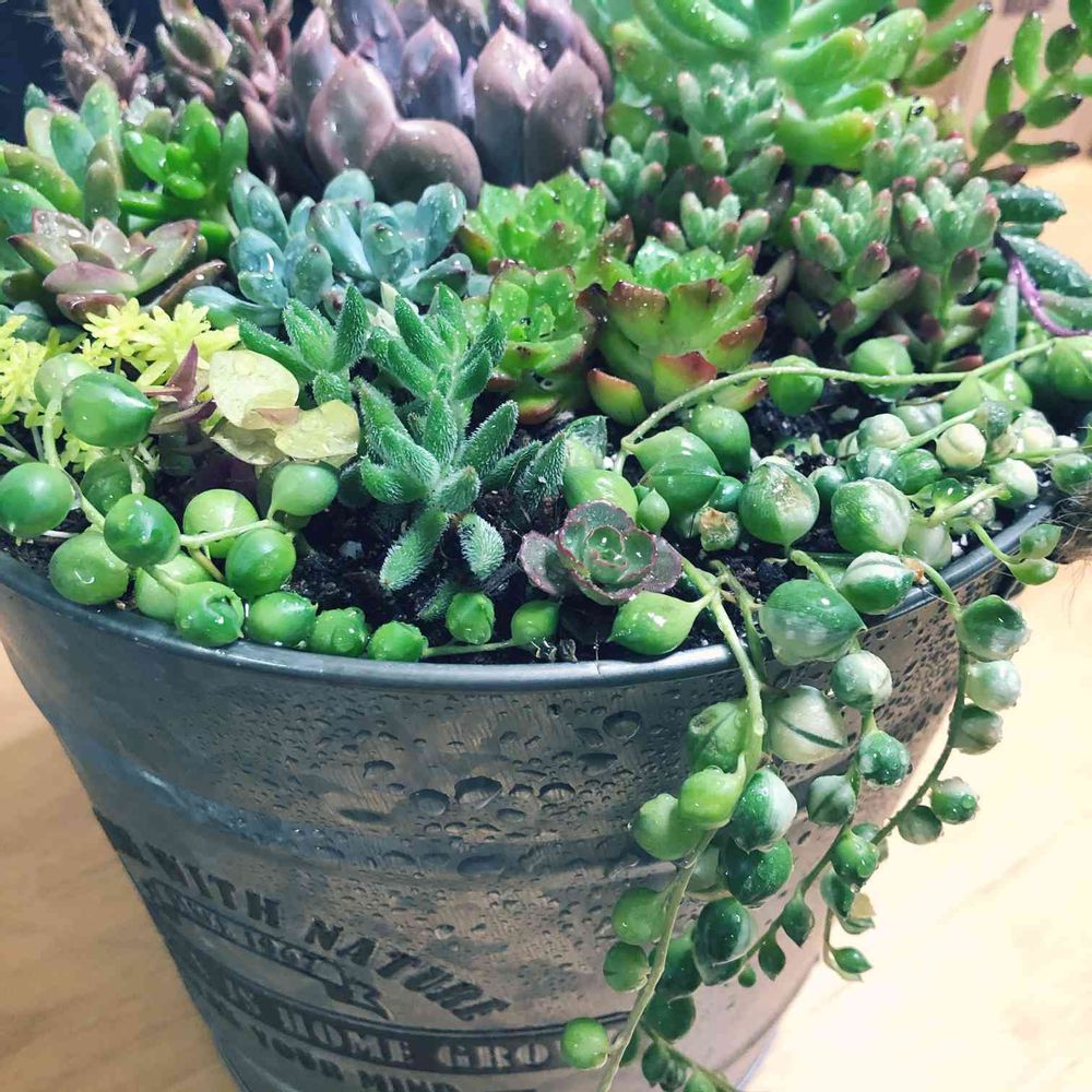 ニトリで買ったブリキプランターLサイズ幅21×奥行20.5×高さ18cm(599円)。底穴がないので、穴を開けて寄せ植えしてみたら、可愛く仕上がりました。😍💕