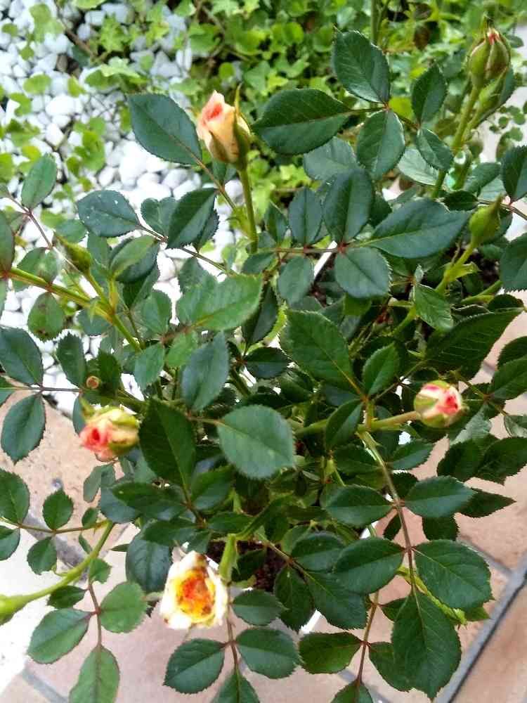 葉っぱばかりで購入してきて、2週間余りでたくさんつぼみがついた、花開きそうなバラ「ミルキーウェイ」🌹