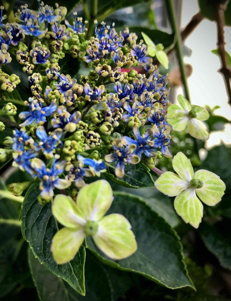 装飾花は白筋の入る緑色で、両性花は透き通った濃いブルー😍
