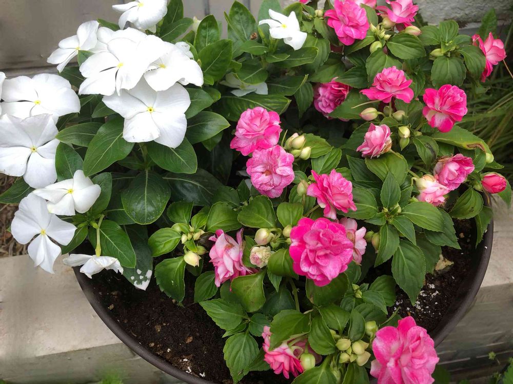 あ!写真は、白→日々草 ピンク→八重咲きインパチェンスです。