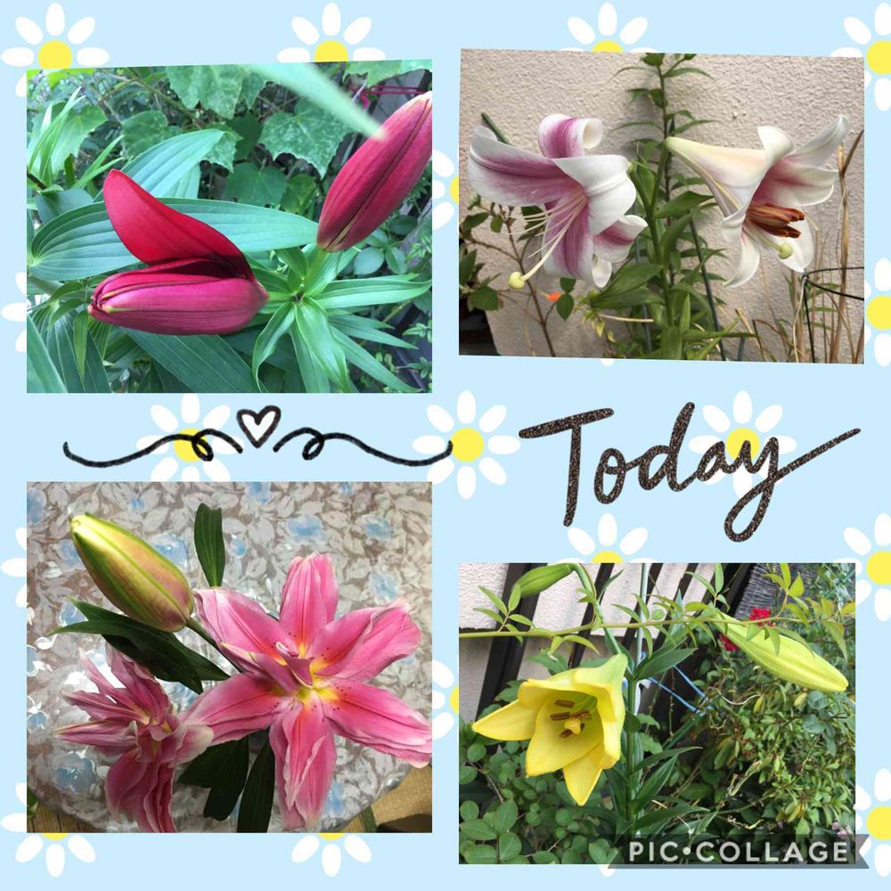 ゆり達が咲き始めました。春先、セールで3袋位買ったのを全部鉢に植えたのが、開き始めました。カサブランカはまだ、先のようです。下の八重の百合は珍しいので、1本180円で買って来ましたが、おしべ、雌しべがないようです。取る手間がなくていいけど、種は出来ないのかな?今日はとても暑くなりそうです。マスクがツライですね。^o^
