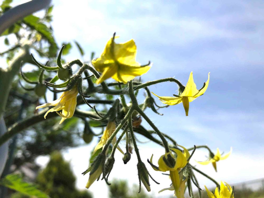 🍅トマトの花、実は丸いのに花はツンと尖っていて黄色ですね。