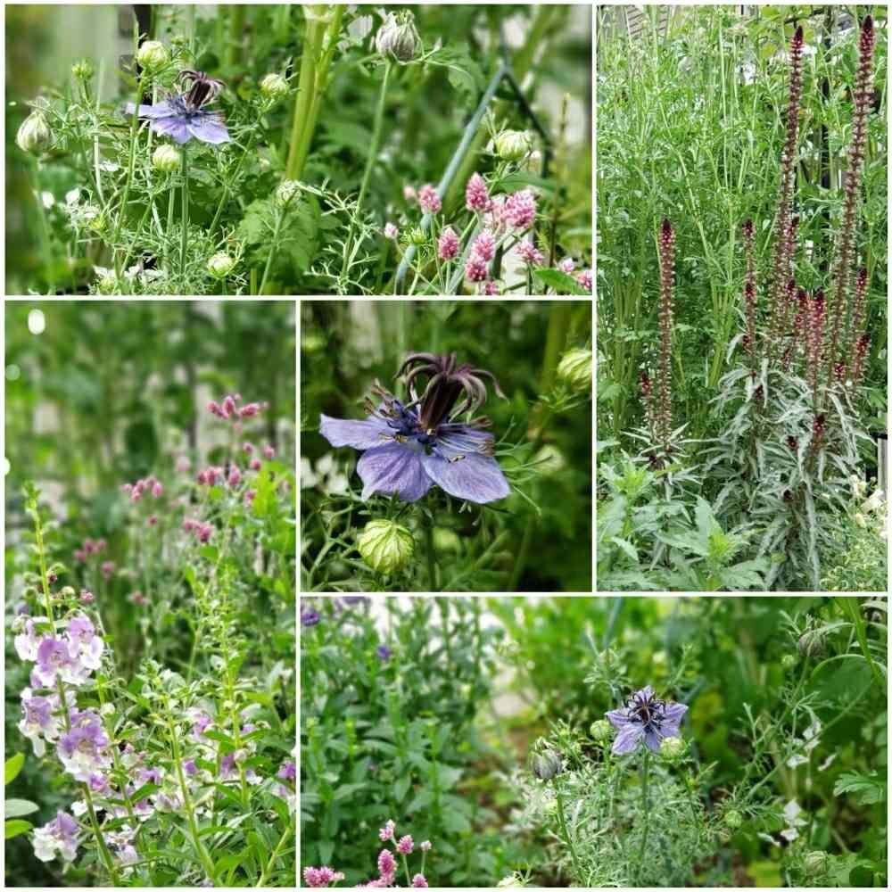 雨の朝ですが、リビングから花壇を見てみるとニゲラの花数が増えていました。