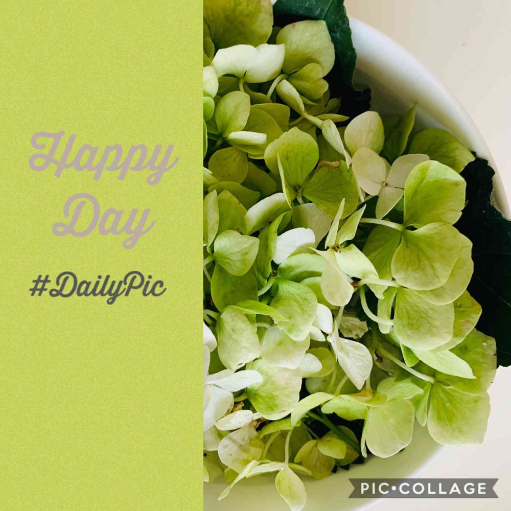 風がつよくて鉢植えアジサイが棚から落ち折れてしまったの。可哀想に。で、急いで水に入れてあげました。