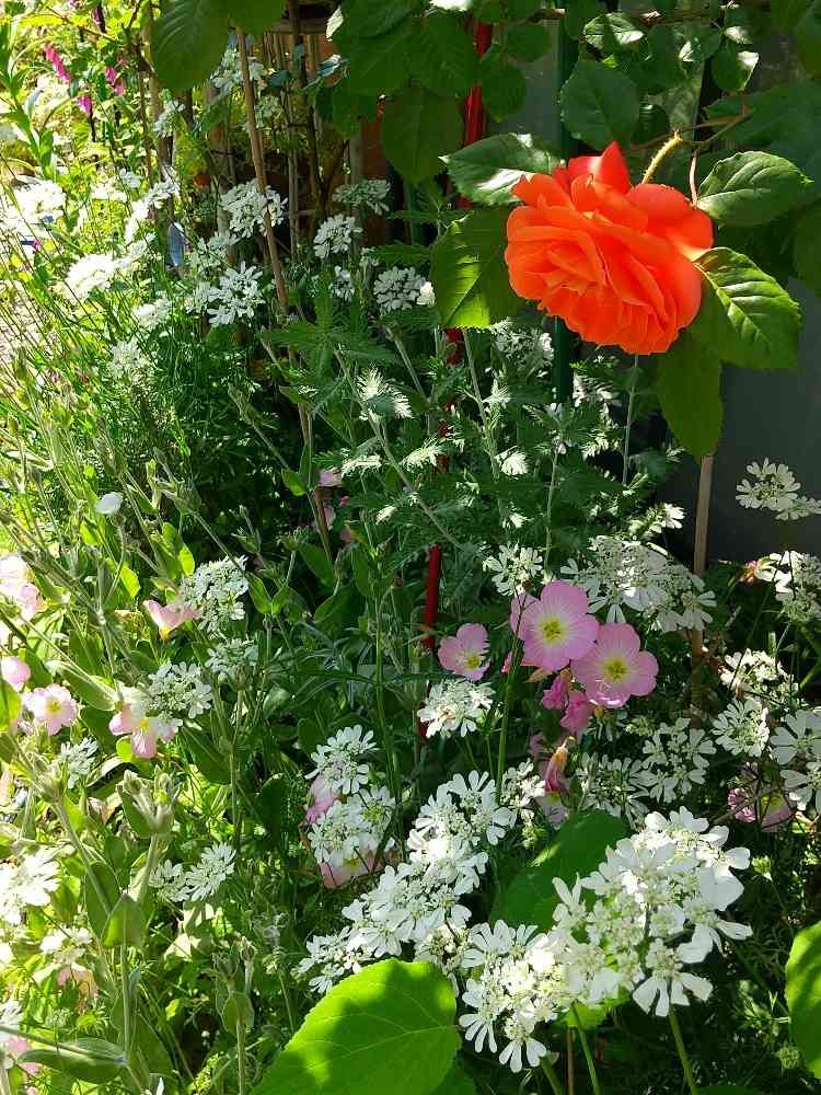昼咲き月見草オルレアさんに負けじと背高のっぽさんに❣️アンネのバラの下で涼んでます😊