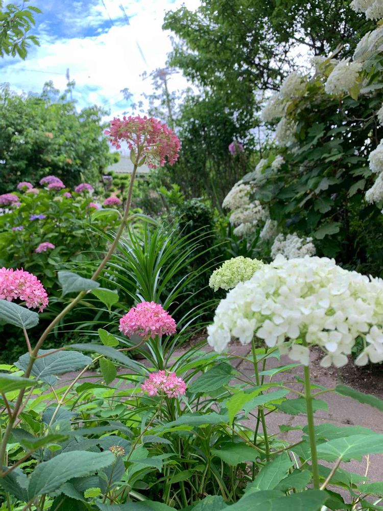 白いアナベル、ピンクアナベル、柏葉紫陽花に青空、とっても素敵です🙂💕🌸🌸