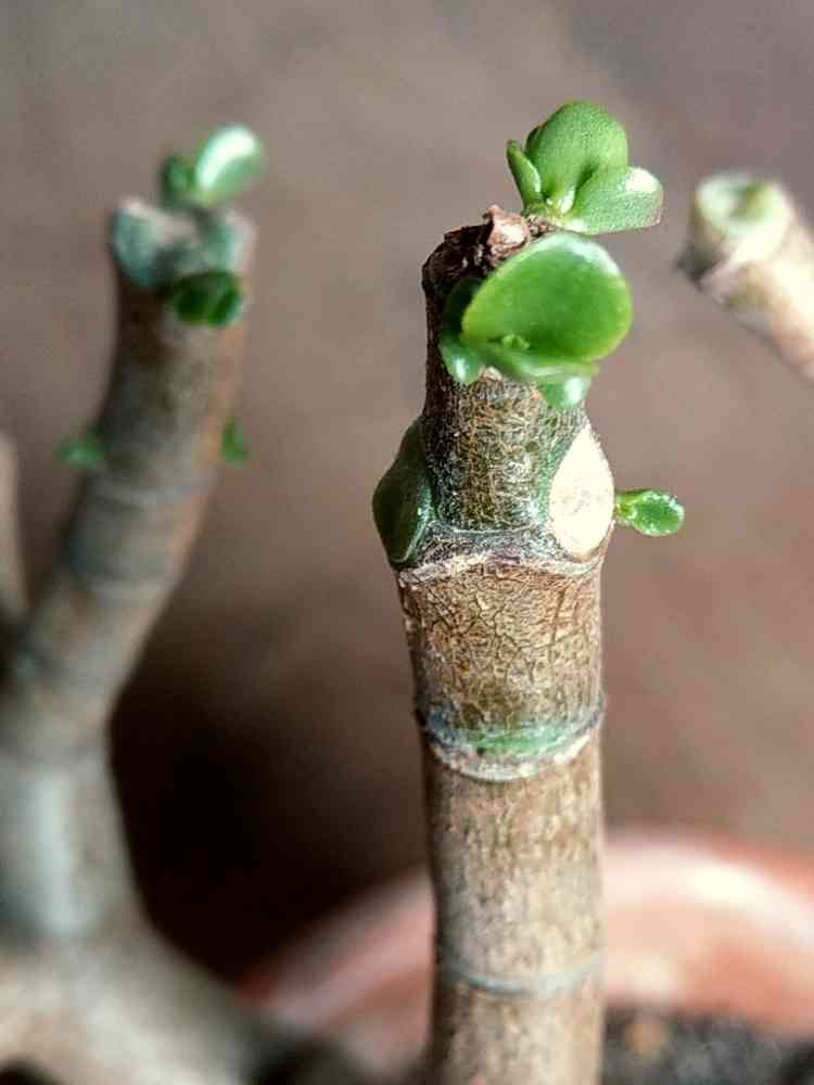 かなり小さくなった金のなる木に、新しい葉が出てきました。良かった🌱