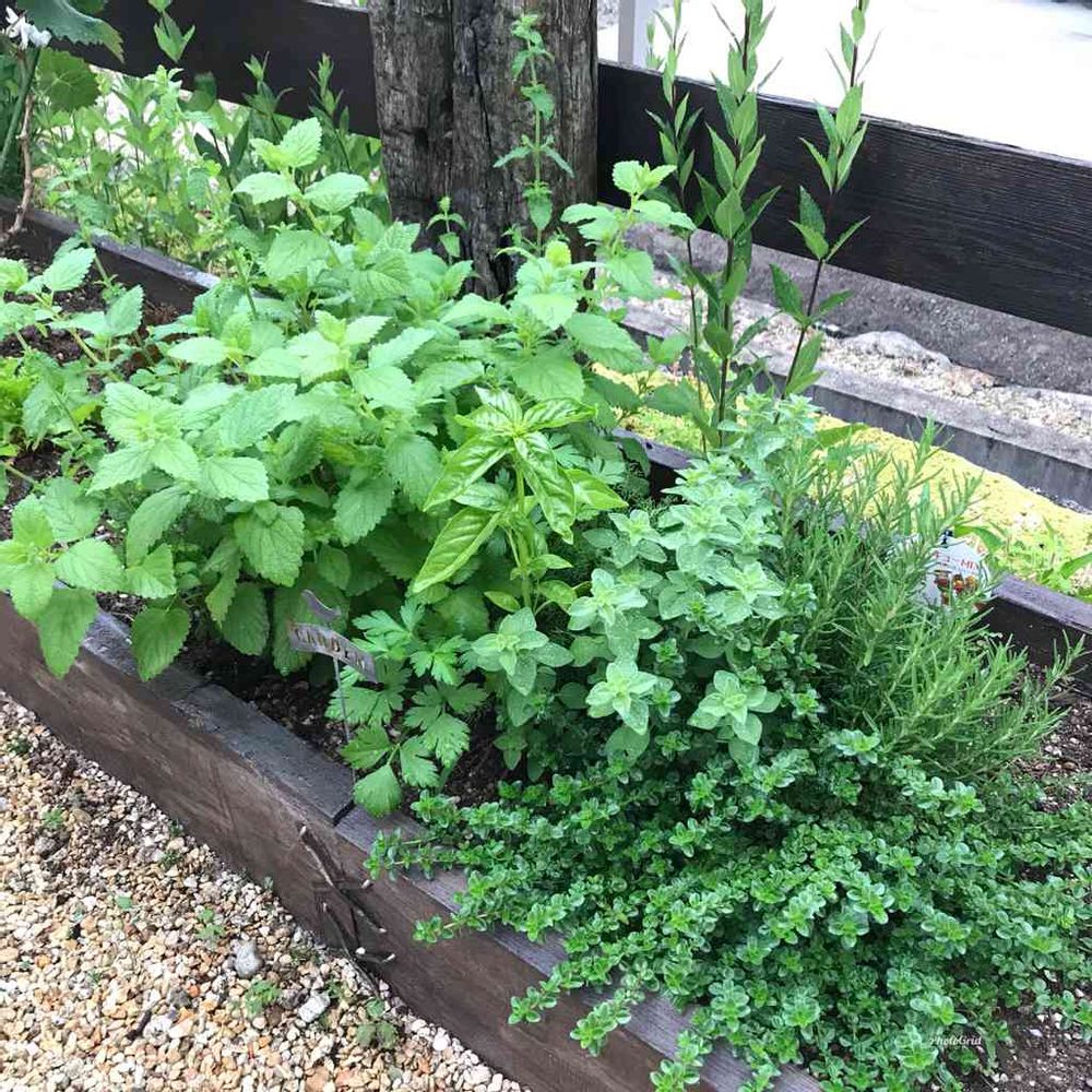 軒先花壇のハーブ🌿達。レモンバームの裏にコーラプランツも隠れている。生長を予測して植えなきゃいけない寄せ植えは、なかなか奥深いね〜。
