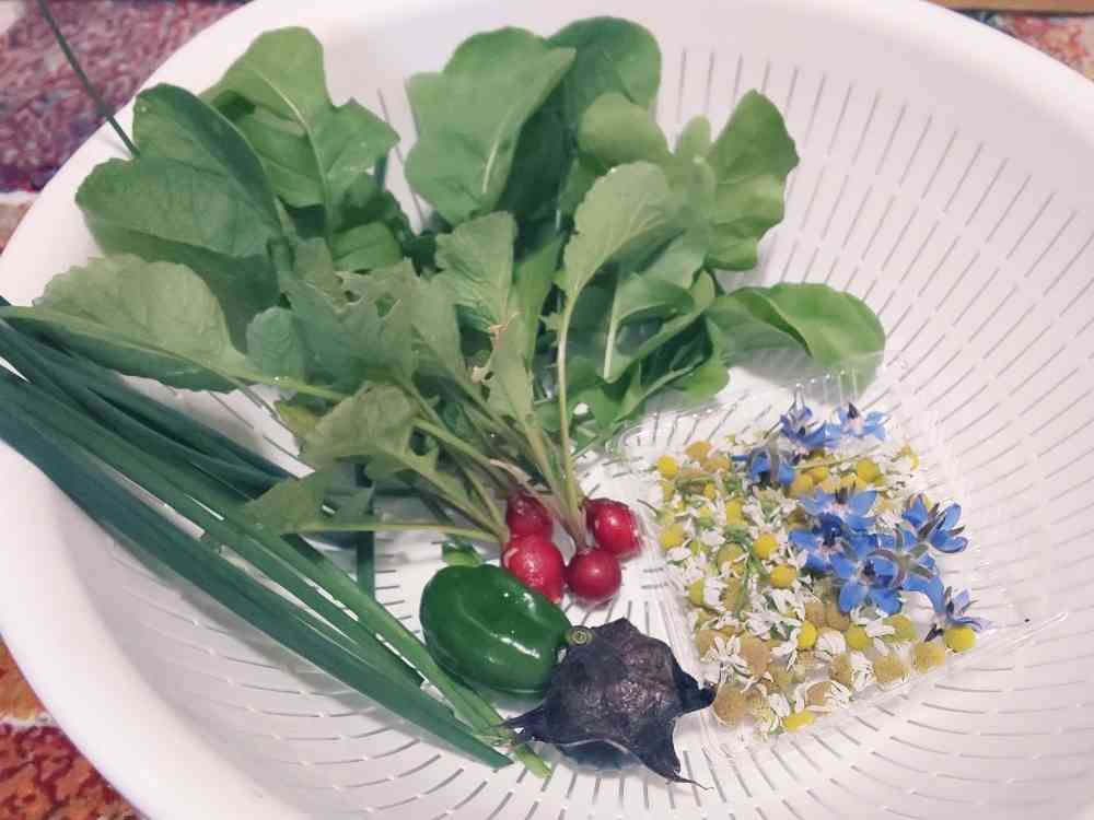 一番果の米なす・ピーマン、ルッコラ・チャイブ・カモマイル💛ボリジの花💜そして二十日大根~三十日かかっても羽根つきの羽の様❗️😅