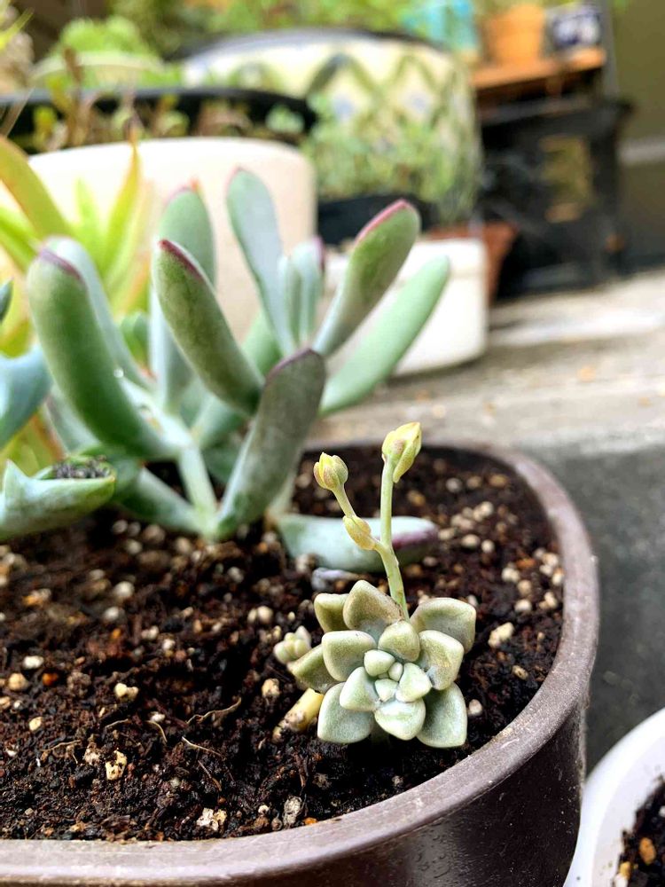 たった1センチぐらいの小さな多肉ちゃんからも花が伸びるんだね…
