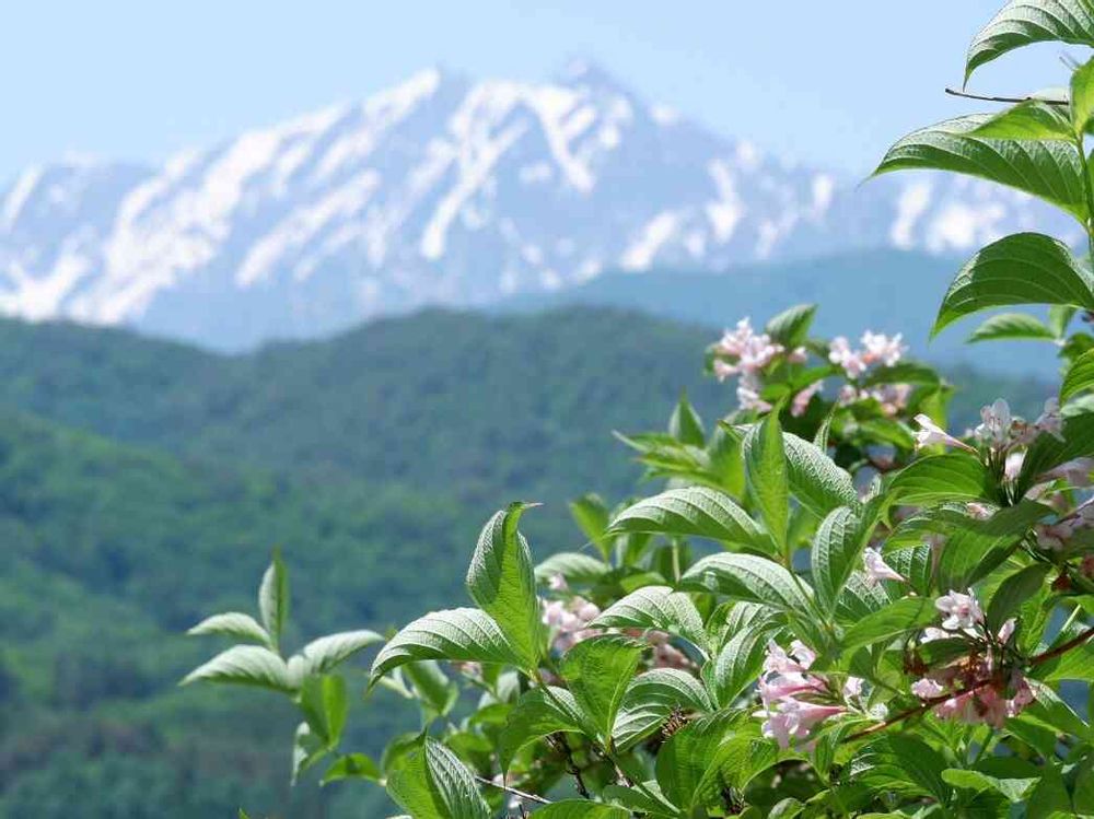 北アルプス鹿島槍ヶ岳を望む道路の谷沿いに咲くウツギの花🌸