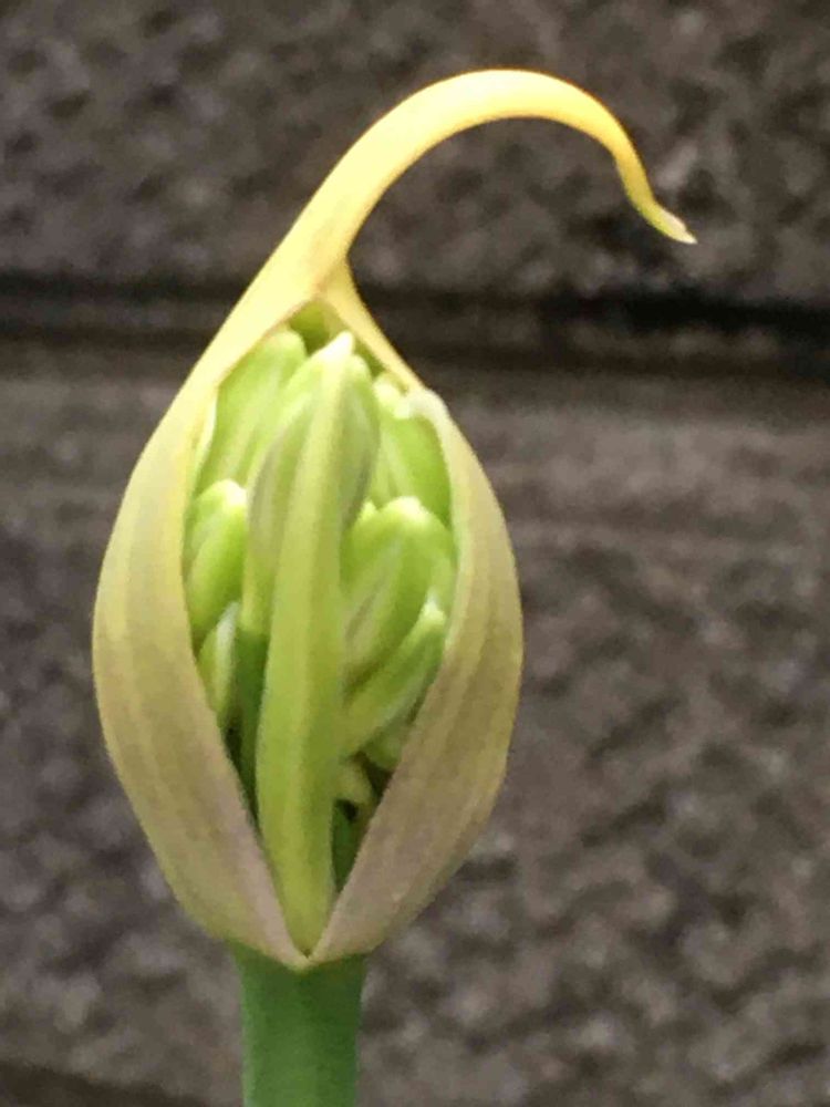 コブラのようなつぼみがぱかっと開きました。鉢植えで根が張ってきたので地植えにしました。でも数年咲きませんでした。今年やっと咲いてくれます。
