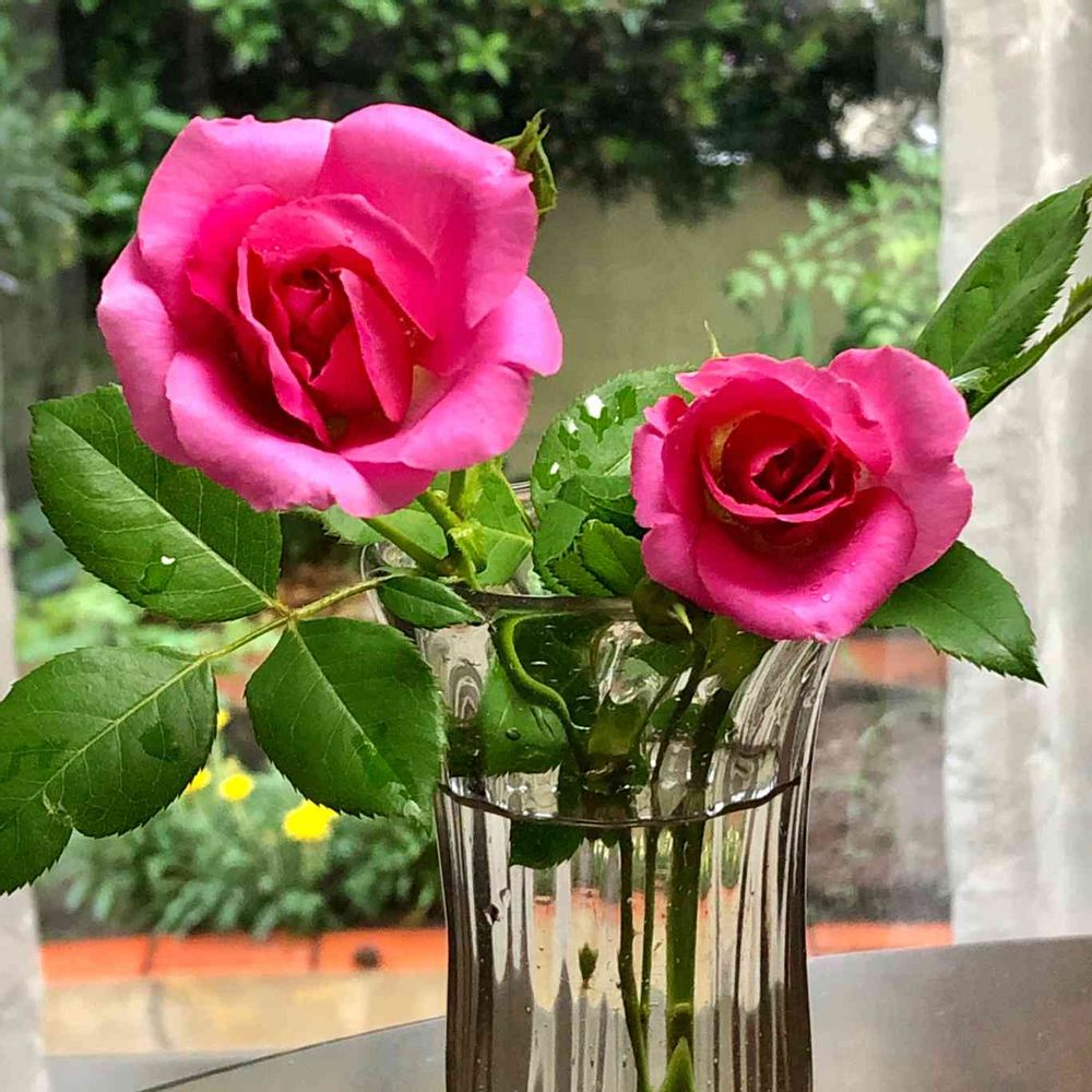 大雨 洪水 強風 雷 注意報が出ているので、庭の咲きかけのバラを救出…グラスに挿しました🌹