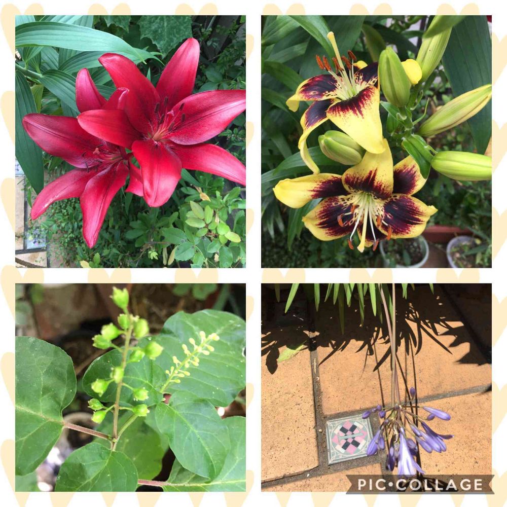 ゆりが咲いてしまいました。雨☔️が降りそうなので、散る前に写真撮っておきました。思ったより濃い色で、私としては薄い色が良かったな。あと、数珠サンゴの花と実、そして、姫アガパンサスの花です。