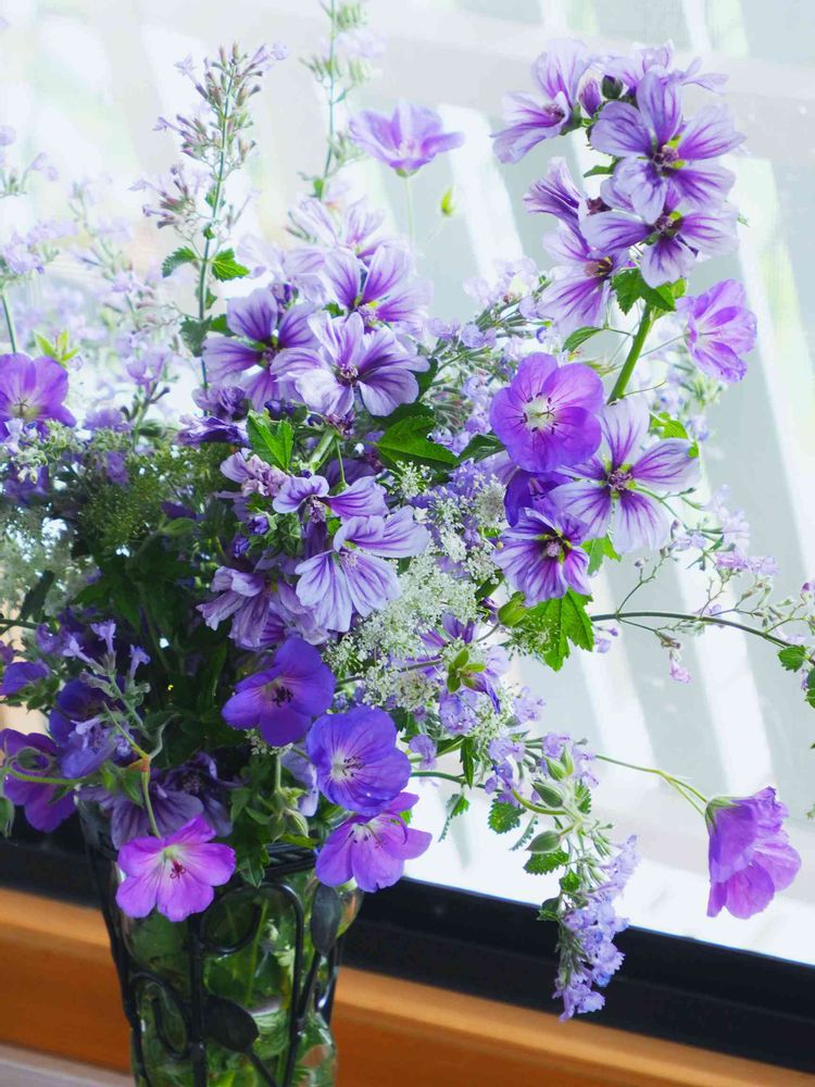 庭で伸び伸び育った花たちなので、室内で飾るにはちょっと嵩張るのですが、いっきに窓辺が華やかになりました。