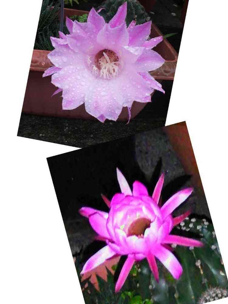 投稿、朝の姿を又投稿します、と言っていましたがあいにく早朝より土砂降りの雨で写せませんでしたがようやく小康状態になったので今の花姿をpicします。下が昨夜23時頃、上が現在14時30分の姿です。同じ花ですよ!どちらがいいか、